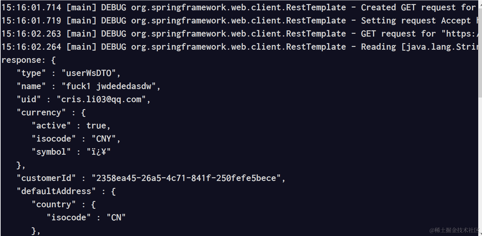 假设我用Hybris API调用的方式,返回Backoffice里维护的这个用户的全部信息: