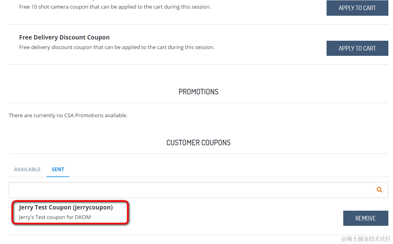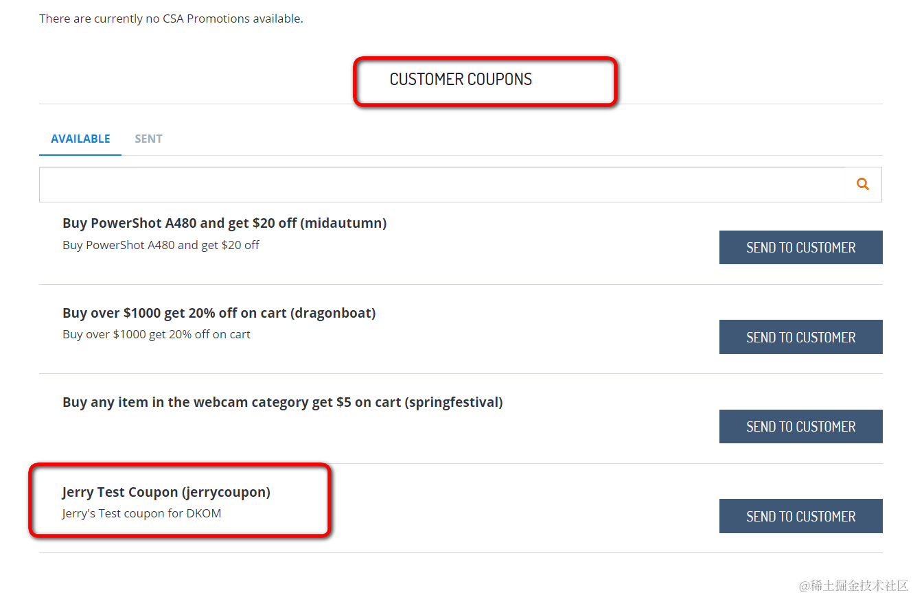 选择其中一个,比如ID为jerrycoupon, 点击Send to customer按钮,就会出现在Sent区域: