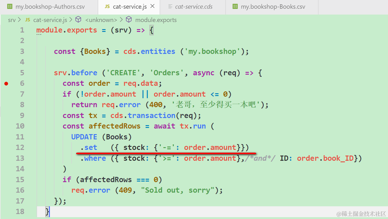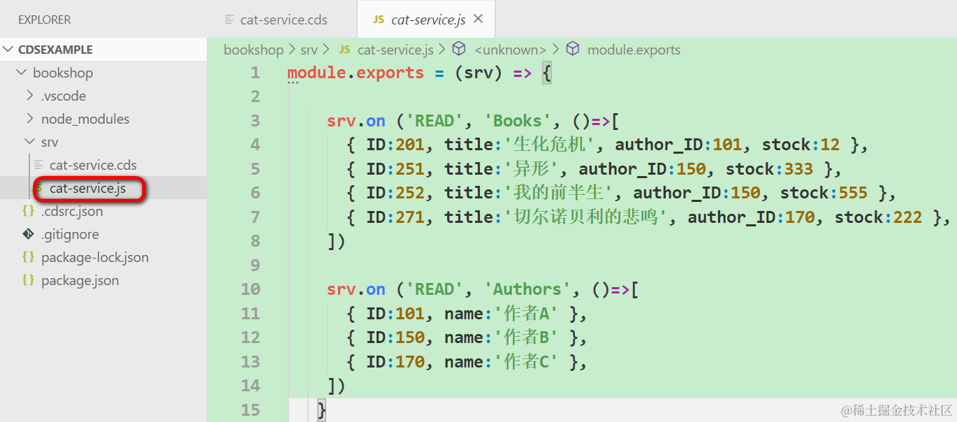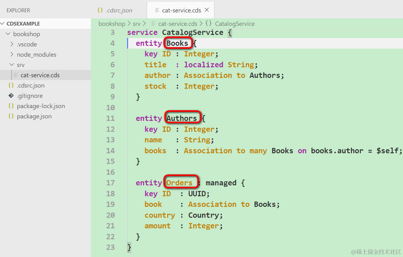 新建srv文件夹,下面创建文件cat-service.cds,完成Books,Authors和Orders的建模,即定义每个模型的字段,以及模型间的跳转关系: