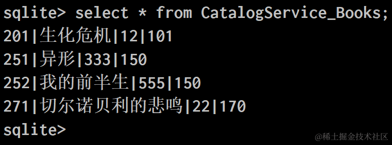 登录sqlite控制台,使用select语句查看成功从csv文件导入的数据: