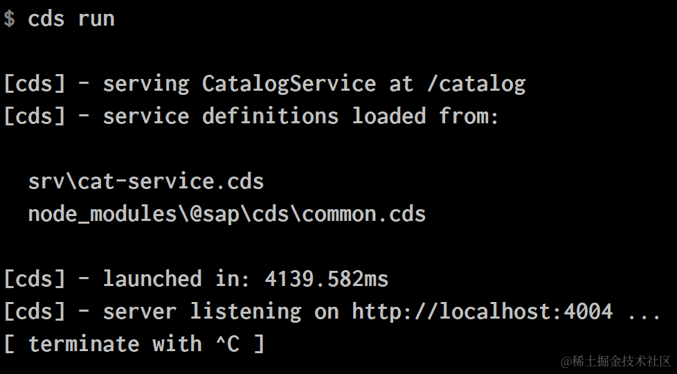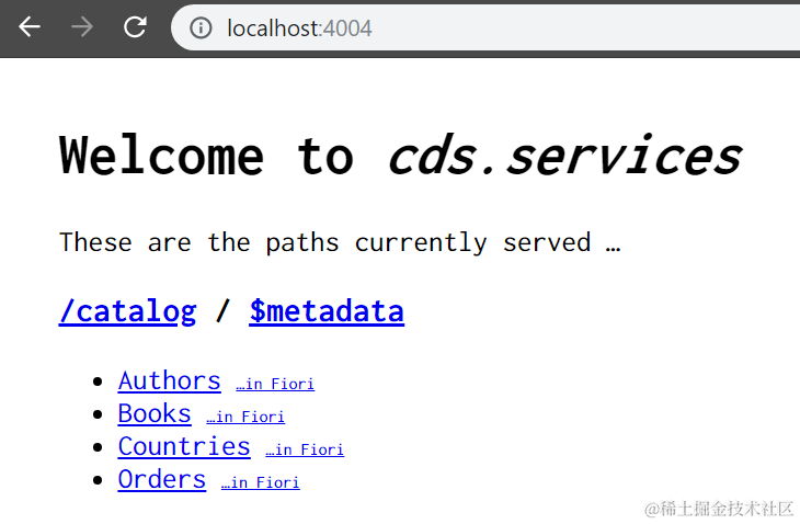 定义完之后,执行命令cds run,就可以本地预览我们刚刚创建的模型了。这个命令启动了一个本地服务器,通过http://localhost:4004访问: