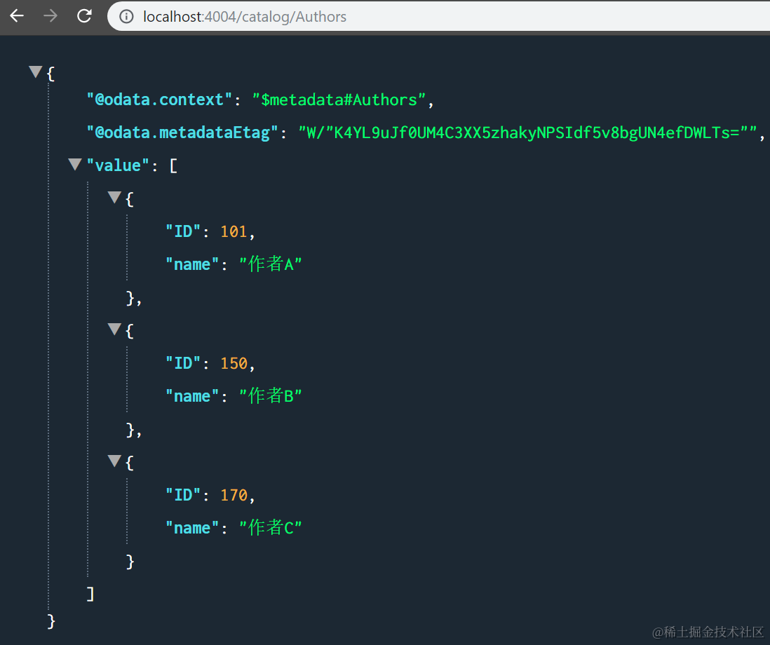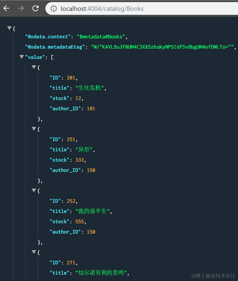这样,再次请求Books和Authors,就能在浏览器里看到mock的数据了: