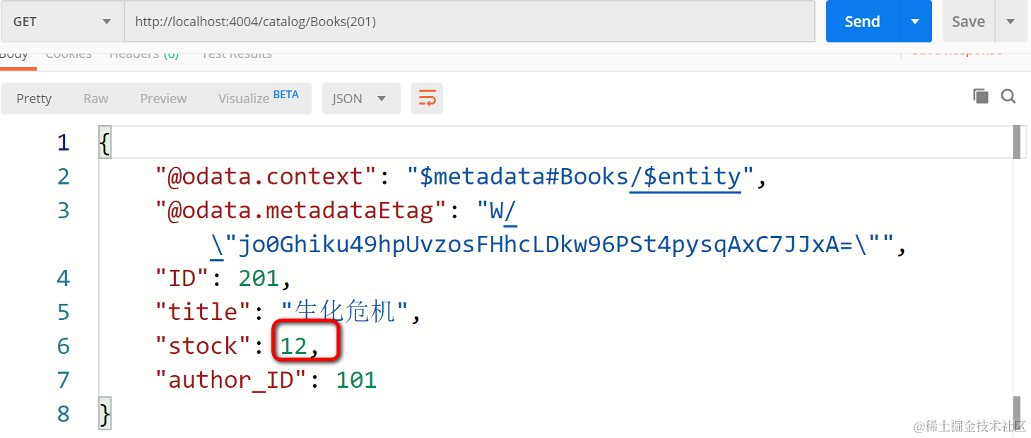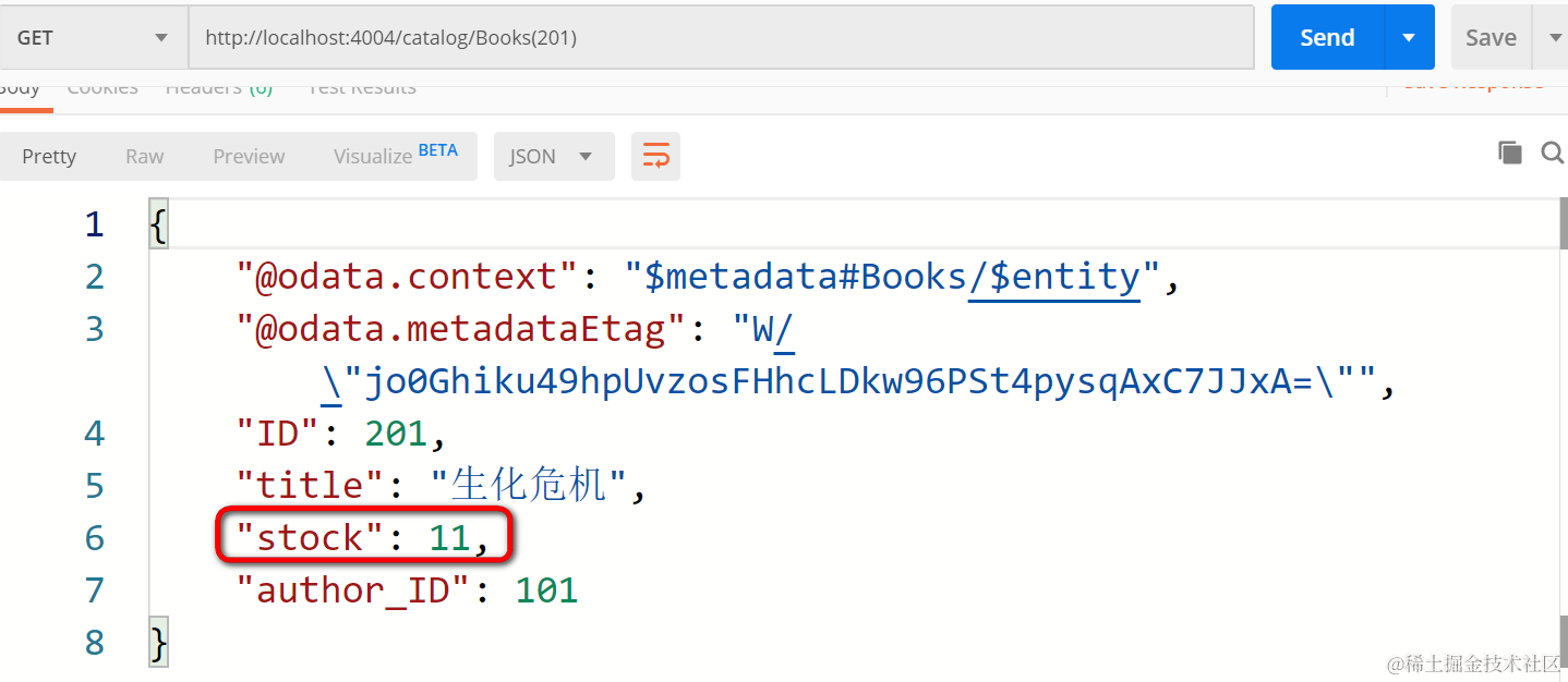 此时再次执行get请求,发现《生化危机》的库存已经和期望的一样扣掉了一本了: