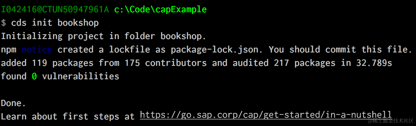 和我们开发一个nodejs应用类似,基于CAP的编程,第一步就是cds init,这个命令会自动帮我们创建CAP应用的骨架和从npm.sap.com下载CAP应用必需的库文件。