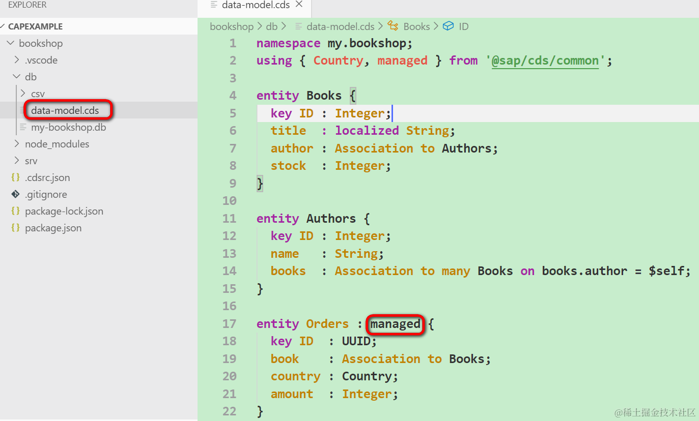 下面我们进行持久层的相关开发。新建一个文件夹db,下面新建一个文件data-model.cds,把之前实现在cat-service.cds里的模型定义拷贝过来。第17行的managed意思是把Orders模型的增删改查操作托管给框架完成。