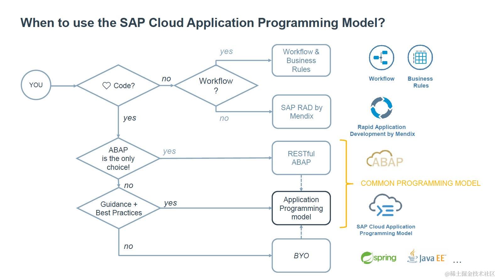Juergen Mueller用了一棵决策树来向大家介绍,对于拥有不同开发技能水平的SAP从业者,可以按照这棵树,根据自身情况和项目需要来选择不同层次和组合的开发工具以及编程模型。