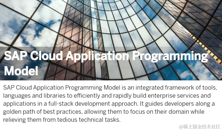 上图右边的分支表明,如果不想抛弃已经习得的ABAP开发技能,可以选择SAP云平台上的ABAP编程环境;反之,如果青睐nodejs,Java这些技术栈,那么SAP云平台也不会让你失望:SAP Cloud Application Programming Model(简称为CAP),是SAP推荐的在SAP Cloud Platform上进行开发的最佳实践。