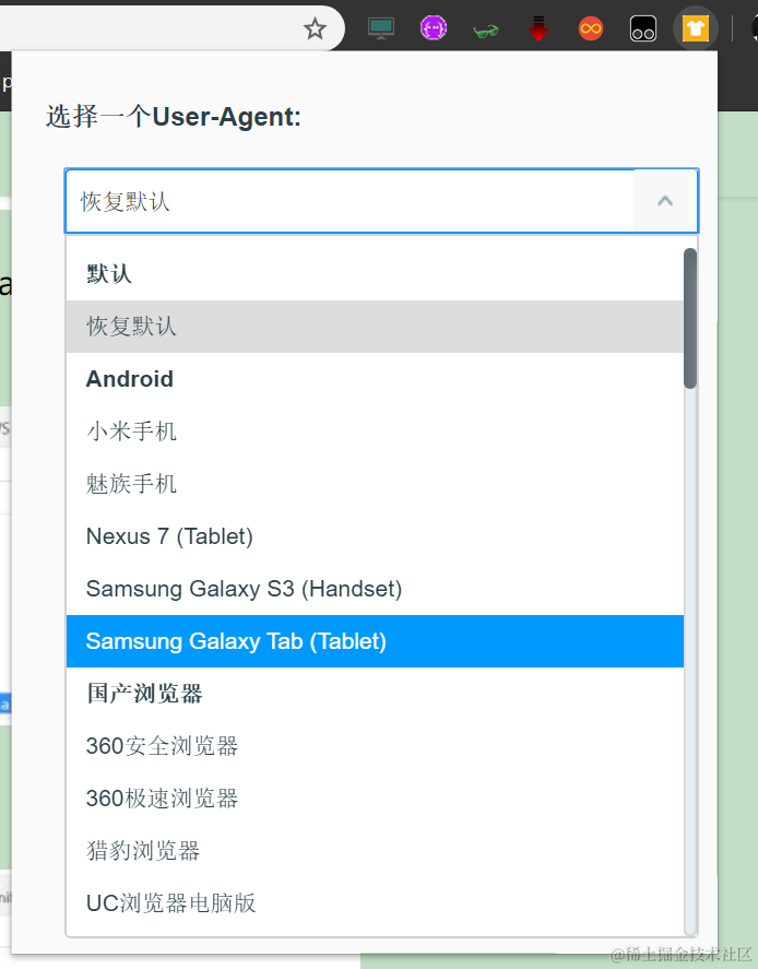 安装之后,点击Chrome工具栏里的黄色图标打开User-Agent的下拉选项: