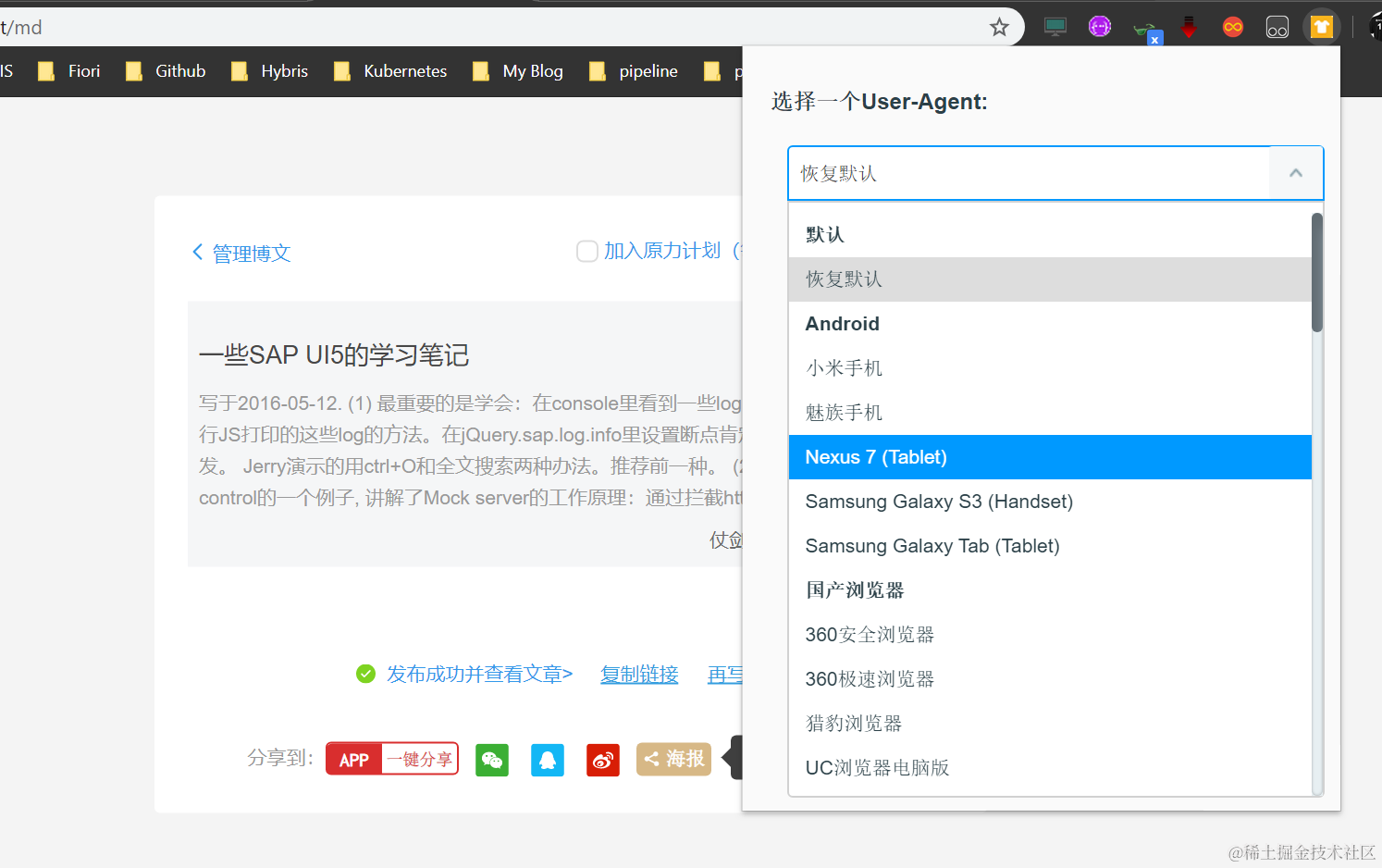 下图是我在笔记本电脑上用小米手机对应的user-agent去打开知乎网站的一个例子,可以看到屏幕下方出现了原本只有在移动设备上才能看到的提示:App内打开