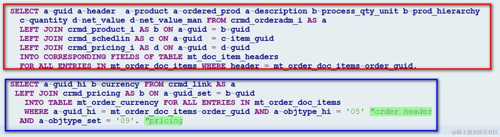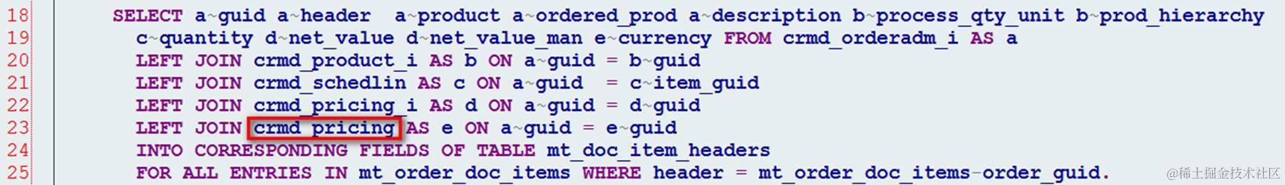 Pricing table和one order table的关联关系和其他字段稍有不同,中间通过CRMD_LINK的guid_set进行连接,因此不方便写到一个SQL里,所有我最后的solution 通过两个独立的SQL来实现。