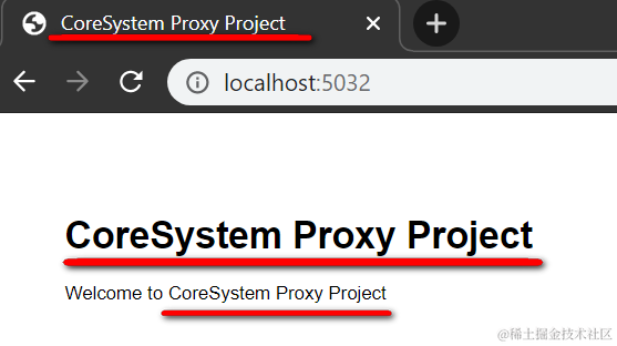 模板源文件里通过井号和大括号包裹的变量title,运行时会被模型字段title的值:CoreSystem Proxy Project所替换,如下图所示: