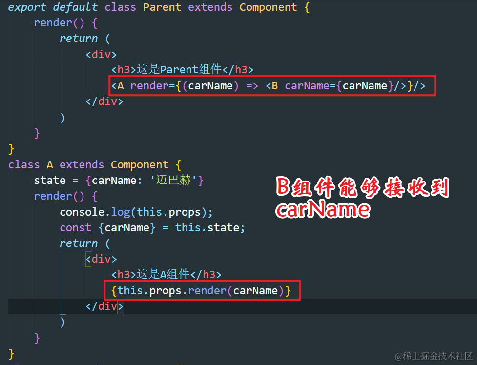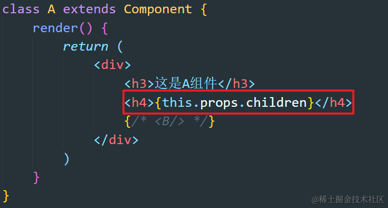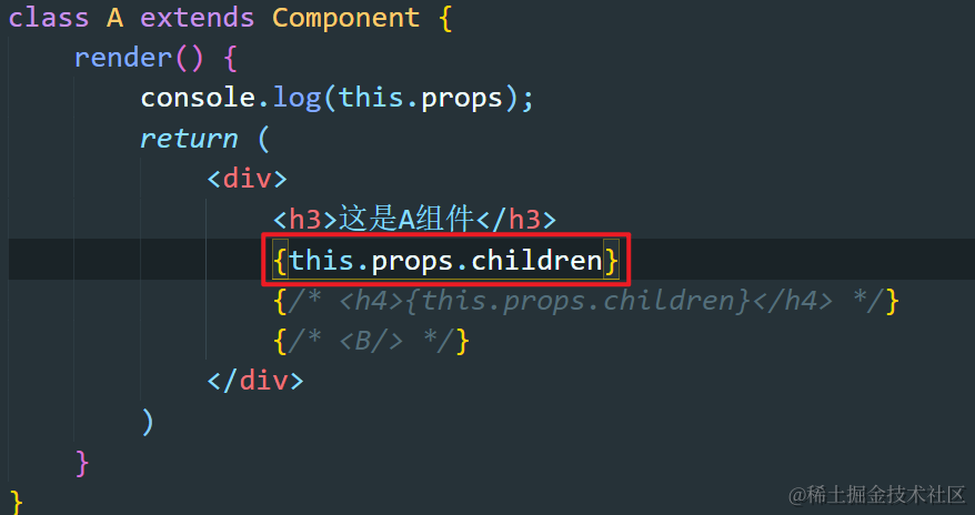 React-60:render props Always_positive 2021-04-25 90 阅读1分钟 组件间包含的内容是什么? 包含的内容是传递给A组件的信息,A组件通过this.props.children可以获得 形成父子组件的两种形式 第一种:直接嵌套 A组件通过this.props.children调用B组件 第二种:A组件中调用B组件 通过renderProps向一个组件的子组件传递props