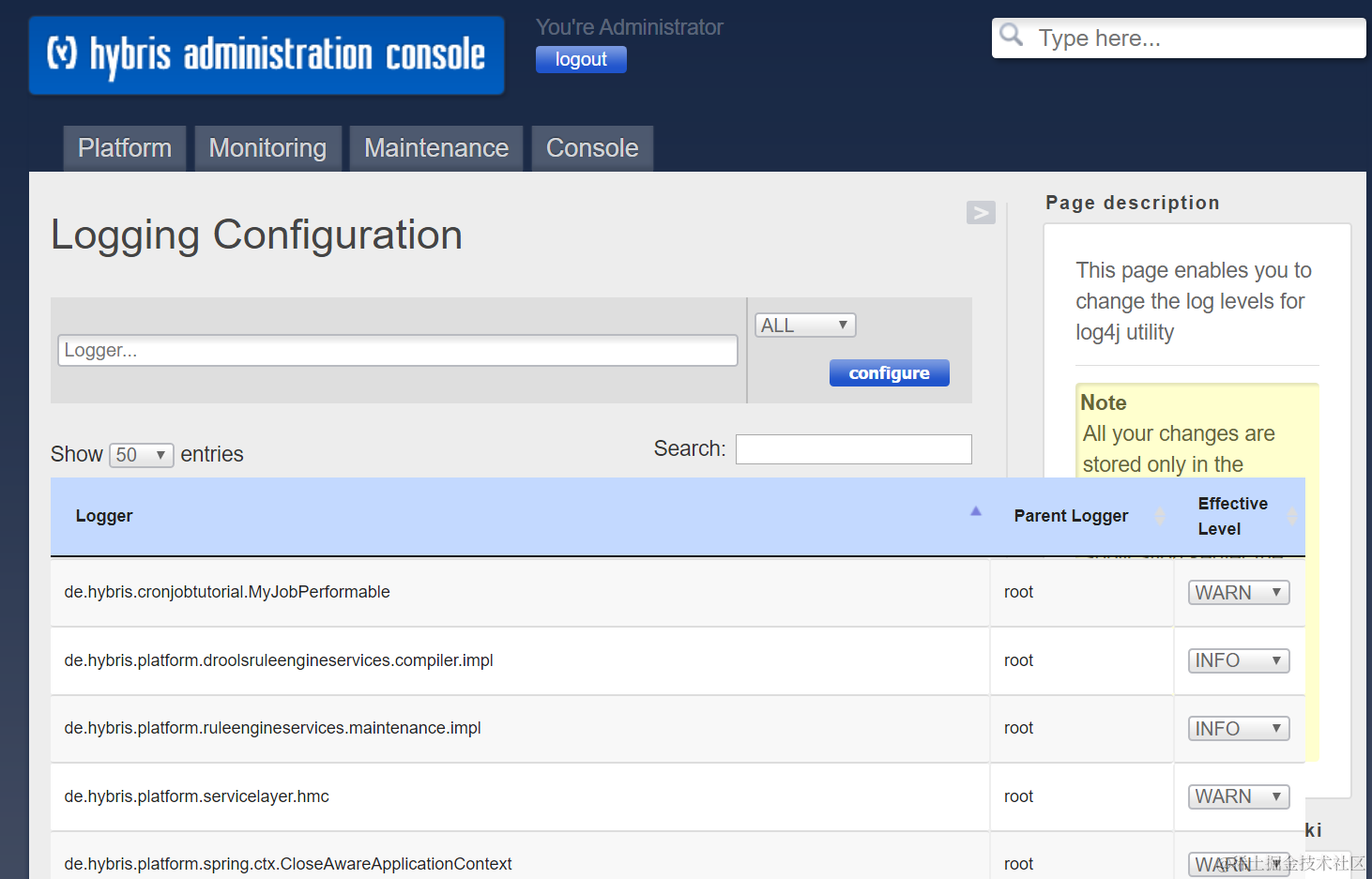 Logging页面,配置被log4j utility管理的各Java类的log level: