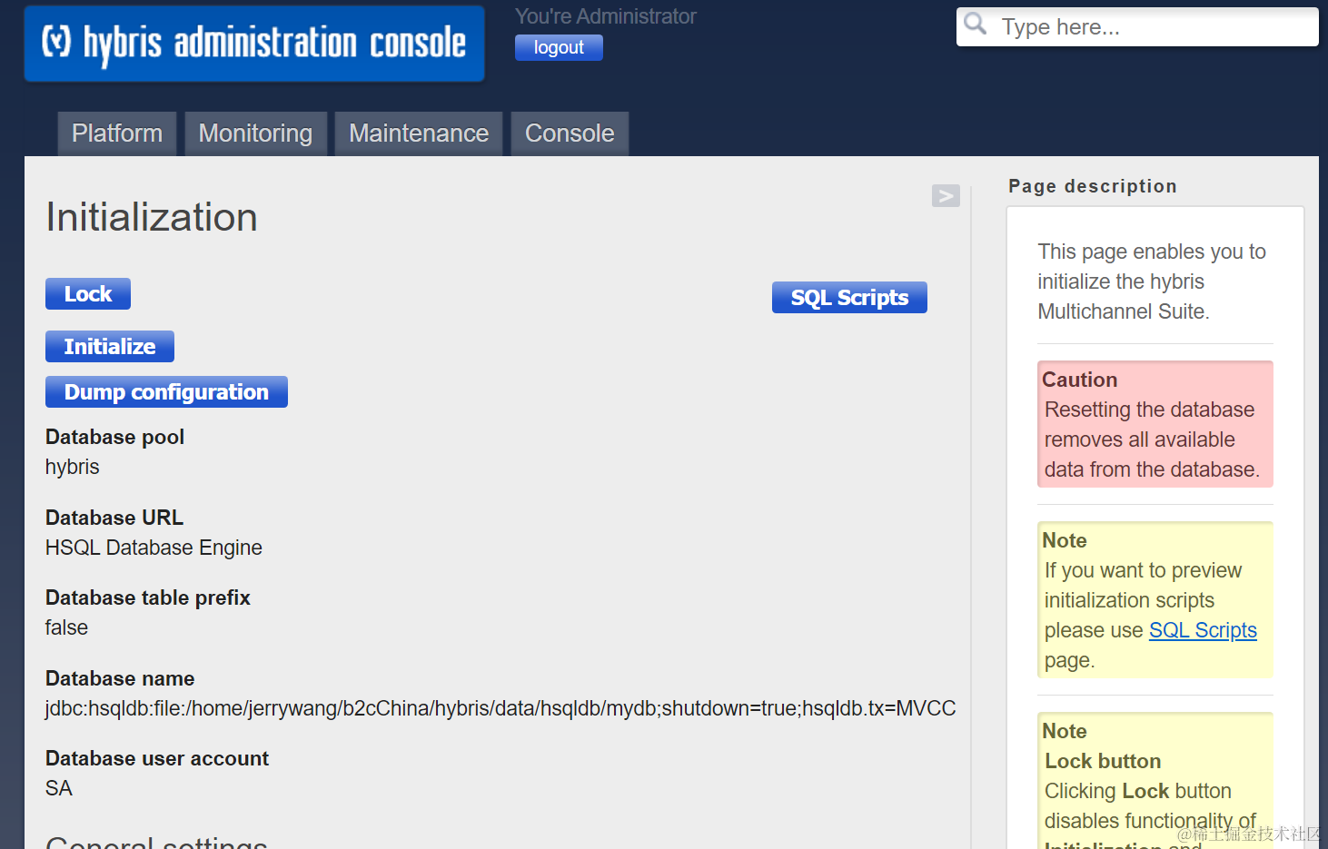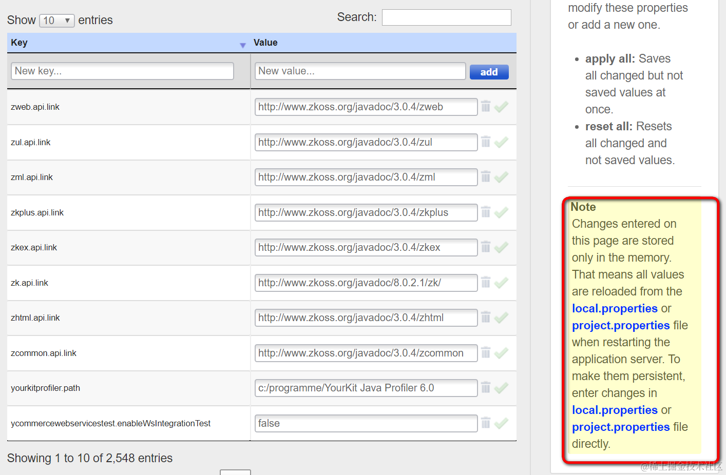 配置页面:所有在此处修改的配置都仅仅在memory里生效,重启之后会丢失。因此需要持久化的属性修改,需要在local.properties或者project.properties里完成。
