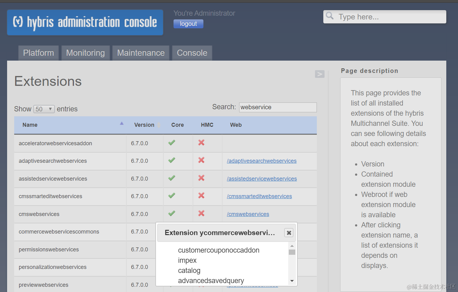 Extensions界面显示了当前tenant上所有安装了的extension,单击某一个,会显示这个extension依赖的其他extension列表。