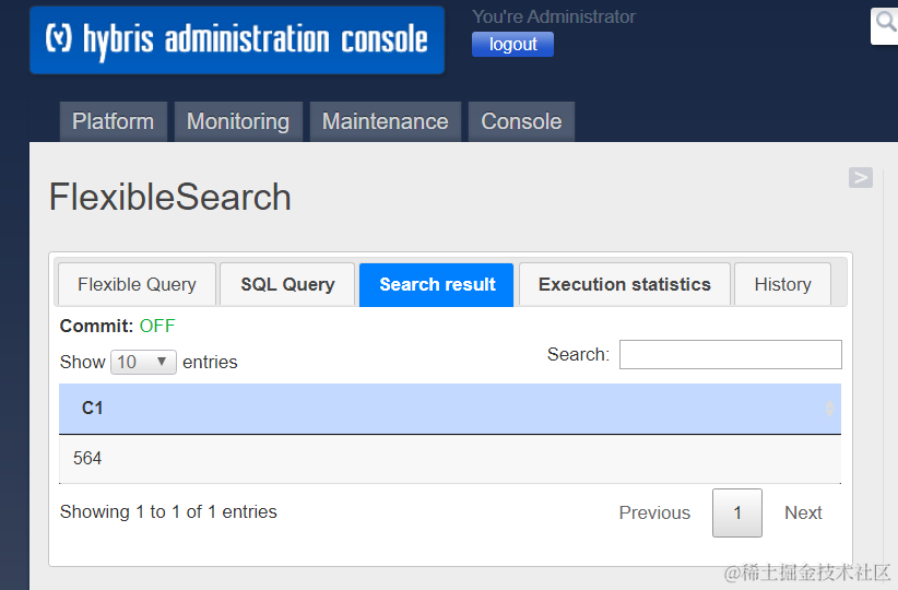 比如Products这张表的条目数为564,这和用flexible search查询出来的条目数一样: