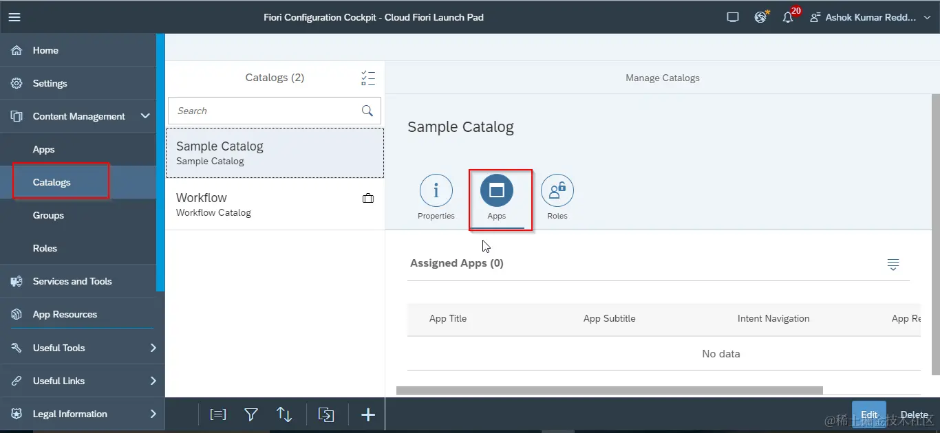 点击catalogs, 切换到apps标签页,点击Edit按钮,添加新的应用到Fiori Launchpad里。