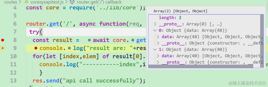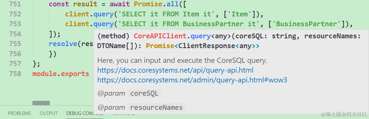 通过Visual Studio Code调试器观察上面这个API调用返回的结果。因为我的752和753行代码分别指定了Item和BusinessPartner的查询,因此API调用返回的响应是一个数组,其内两个元素分别包含了Item和BusinessPartner各前40条数据。