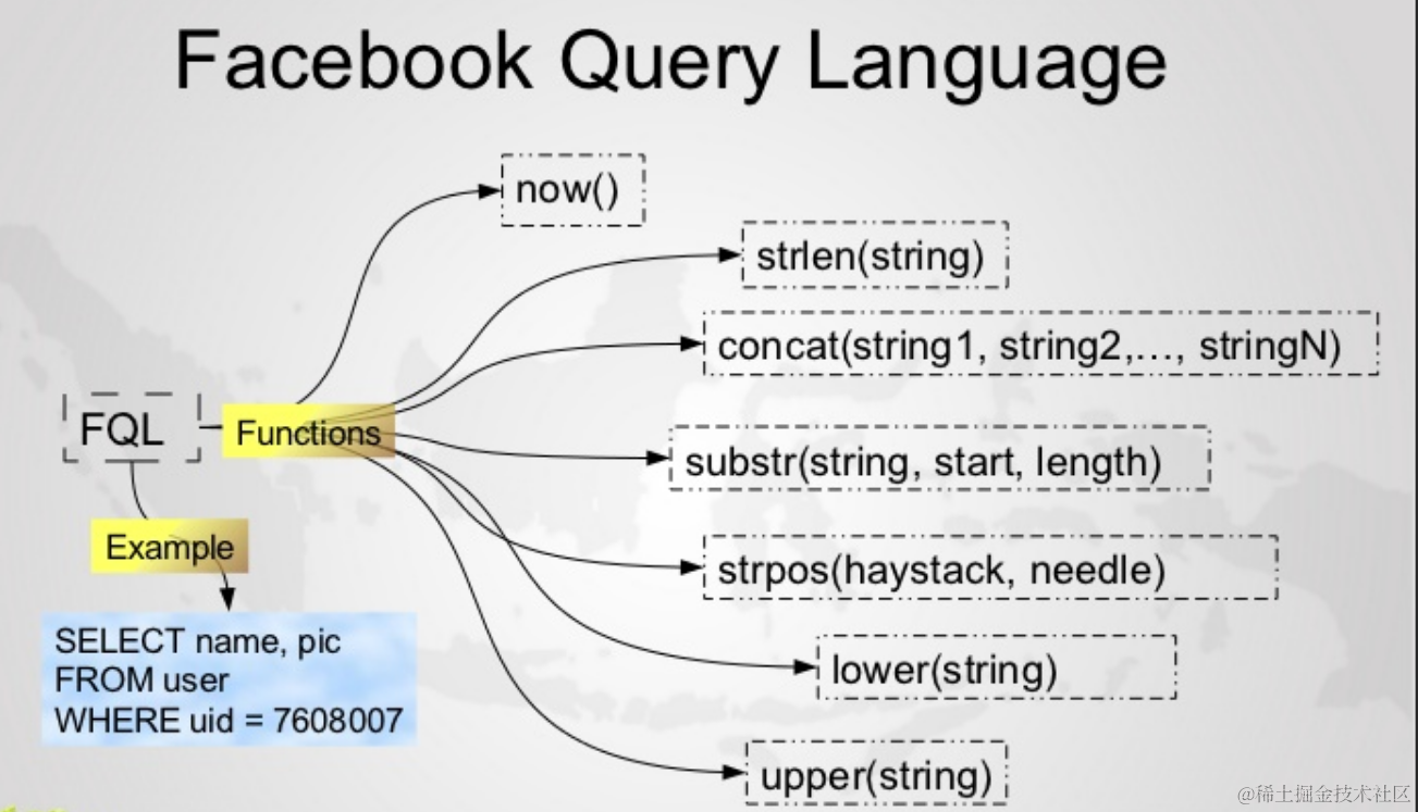 下图是Facebook Query Language的一个例子: