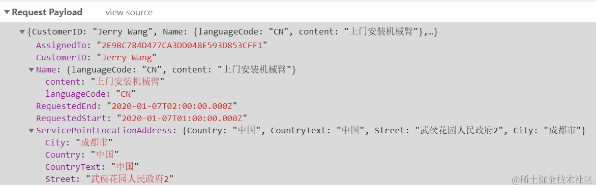 请求正文里包含了微信里填入的全部预约信息,和李小刚在FSM里的GUID. CustomerID,则是前端应用通过我的微信open ID调用微信API获取到的昵称,Jerry Wang. “上门安装机械臂”,是我们为了demo方便,硬编码的一个预约标题。