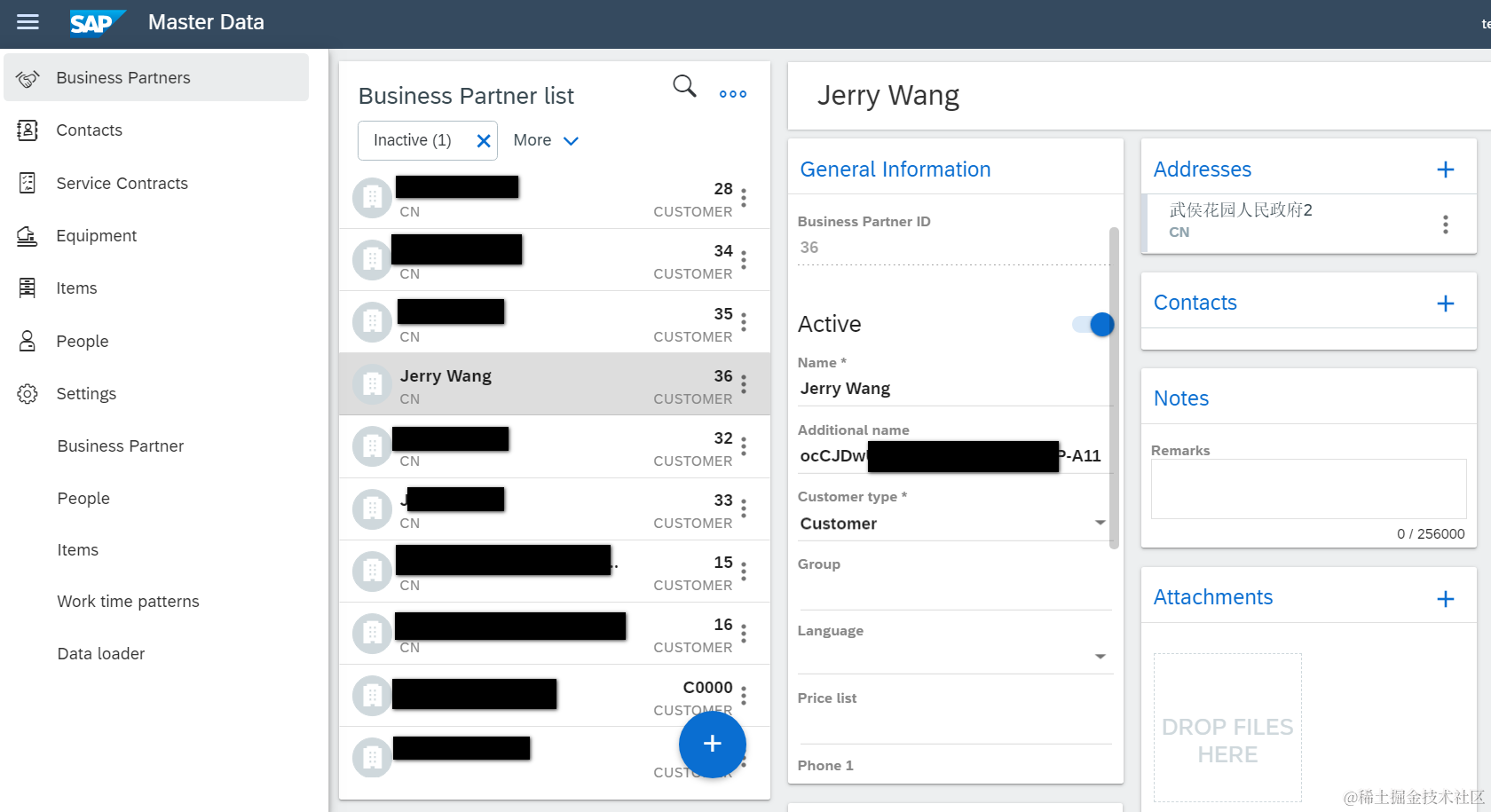 下图是Jerry的个人微信号在SAP FSM里生成的对应BP记录,Additional name即是我微信号的open ID,我们的原型开发里,通过微信号的open ID同SAP FSM BP模型的Additional name这一对字段来维护微信用户和SAP FSM BP一一对应的关系。这个BP的ID为36,记录下来后面会用到。