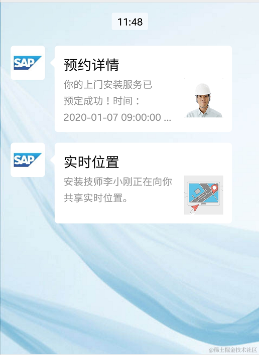待李小刚动身前往客户途中,我们还能在微信里查看李小刚的实时位置共享信息,这是通过SAP FSM提供的技师位置服务加上我们的少许自开发实现的效果。