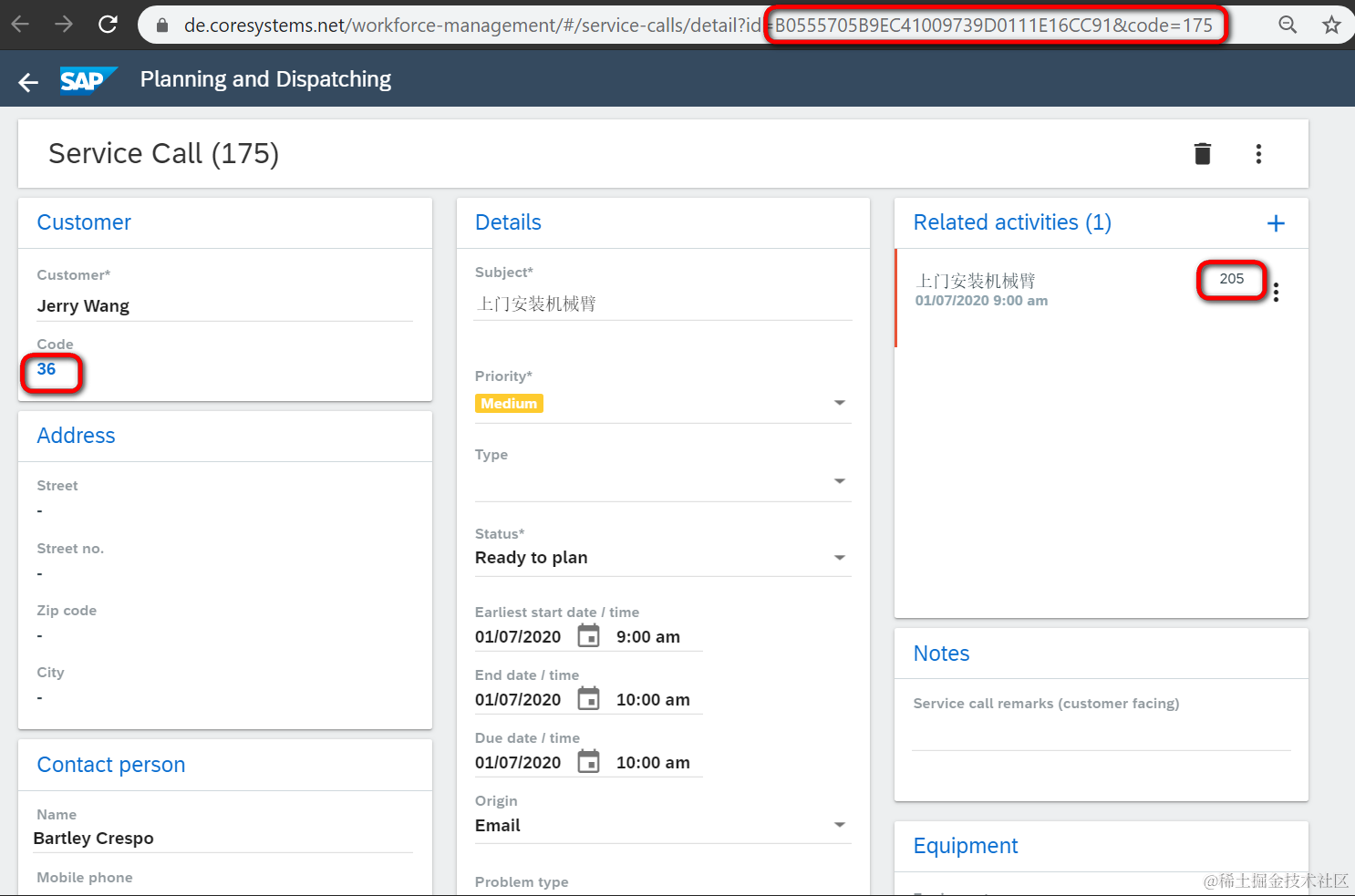 而SAP FSM API返回的ID:B0555705B9EC41009739D0111E16CC91,在系统里实际上是一条Service Call记录的GUID,这条Call的ID为175,服务的客户ID是Jerry Wang,Code为36,即前面提到的基于微信号open ID自动创建的客户记录。