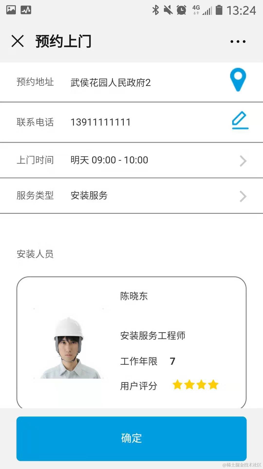 维护手机号和希望上门安装的具体时间段,然后就可以从下拉列表里选择该时间段内可以提供服务的安装技师。这里我们选择名叫李小刚的技师: