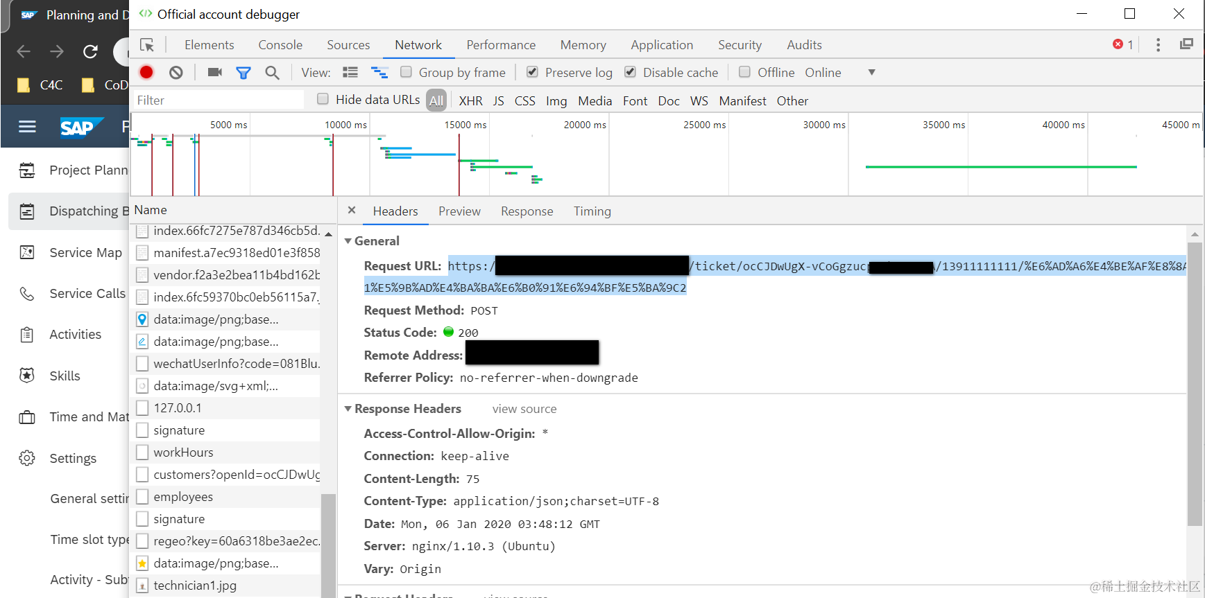 点击确定按钮,运行在微信里的前端应用就通过我们开发的后台服务,向SAP FSM发起API调用。