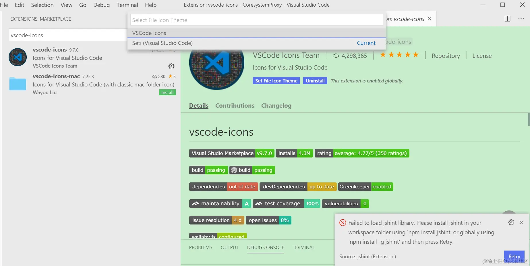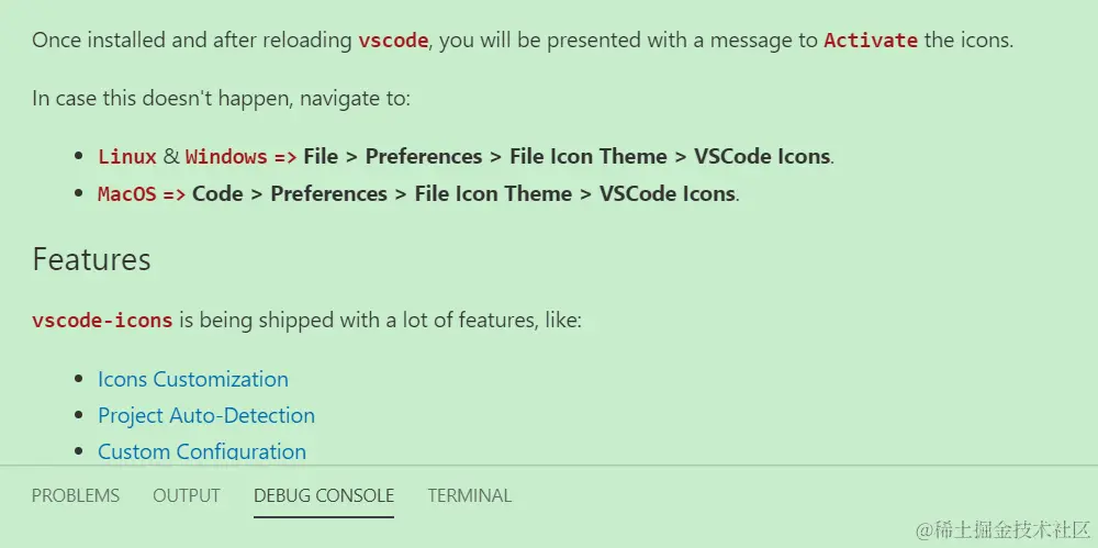 给Visual Studio Code的文件夹和文件替换图标 已注销 2021-04-25 292 阅读1分钟 天天对着Visual Studio Code那千篇一律的图标,是否有些审美疲劳? 没关系,这里介绍一个Visual Studio Code图标美化扩展:vscode-icons: 安装之后,点击Activate按钮激活: 在File->Preferences->File Icon Theme里能看到设置: 看一下应用这个扩展之后的文件夹和文件的图标,是不是美观多了?编程的心情一下好了很多。 要获取更多Jerry的原创文章,请关注公众号"汪子熙":