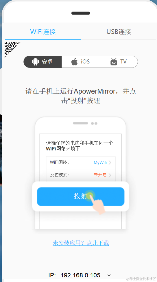 安装ApowerMirror这个软件。可以免费使用,虽然没办法全屏,但是应对一般的投屏需求也够了,毕竟免费的嘛。百度到找到ApowerMiddor官网,下载安装包到本地,安装后启动,选择USB连接: