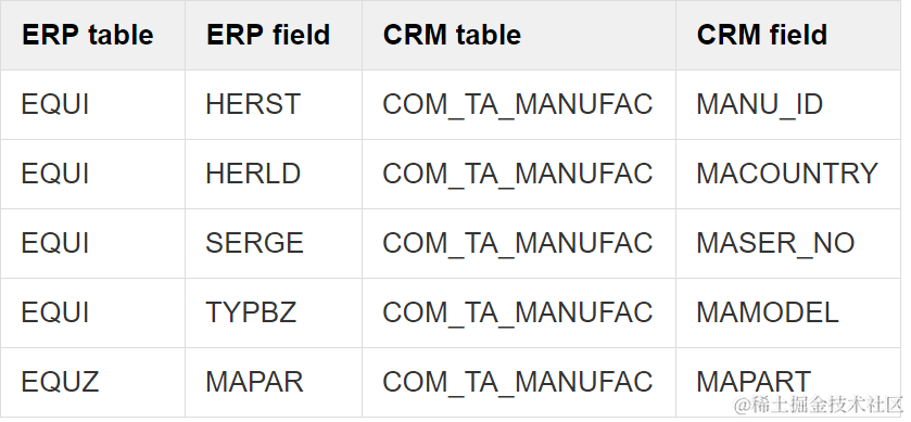 Settype COM_TA_MANUFAC - mapping between ERP Equipment and CRM Individual Object 已注销 2021-04-25 68 阅读1分钟 When the manufacturer related information are downloaded to CRM, They will be displayed in CRM assignment block “Manufacture Information” as below: Mapping table: 要获取更多Jerry的原创文章,请关注公众号"汪子熙":
