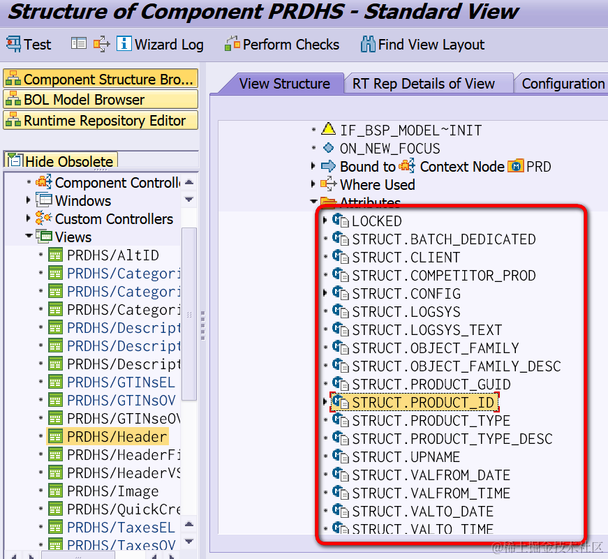 在UI层的CRM BSP component的MVC设计里,Model,即Context node,绑定的是Business Object Layer的模型,因此Context node Attributes文件夹下面,以STRUCT开头的字段,意味着这个字段是绑定到BOL模型节点里的一个字段的,二者存在一一对应关系,如下图箭头所示。而下图蓝色字段LOCKED, 前面没有STRUCT前缀,说明这个字段并非来自BOL模型节点,而是开发者直接创建的,这种字段一般用于应用逻辑里存储临时状态,或是代表当前应用的某个标志位,没有对应的底层存储,在SAP很多产品里也称这种字段为transient field或者calculated field.