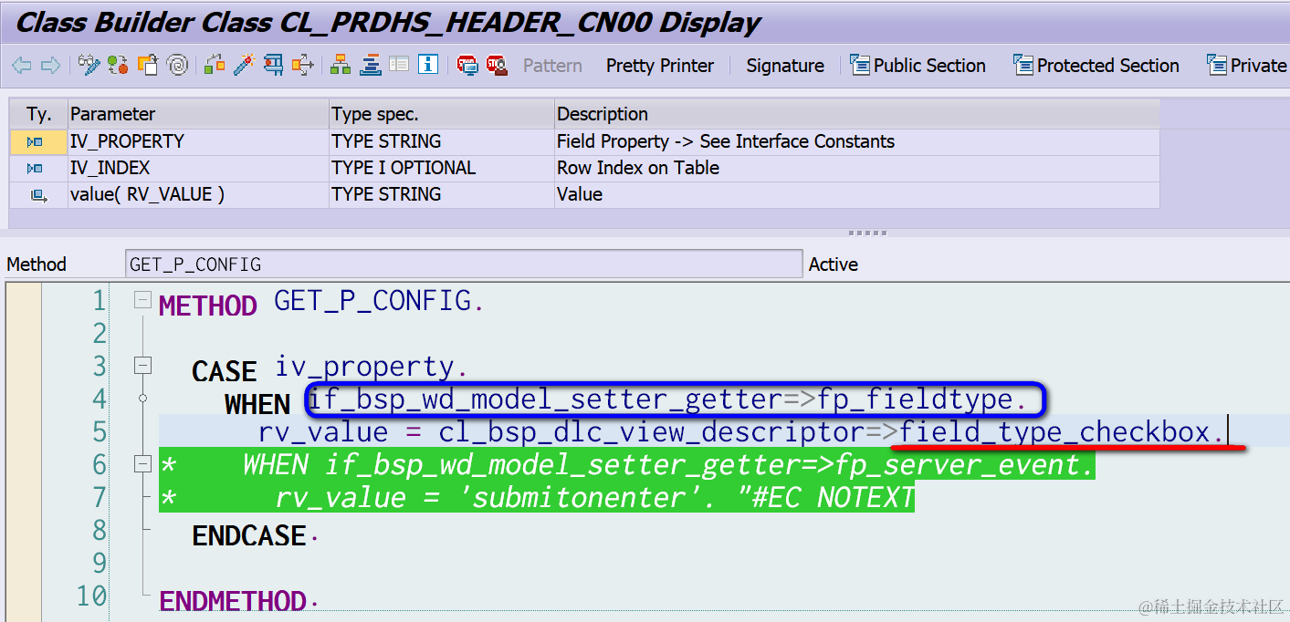 双击进入CONFIG这个字段的GET_P方法里。P的意思是Property,属性。UI框架在渲染CONFIG这个字段时,会调用GET_P_CONFIG这个接口,询问应用:你想把CONFIG这个字段渲染成什么类型(下图第4行的fieldtype)?