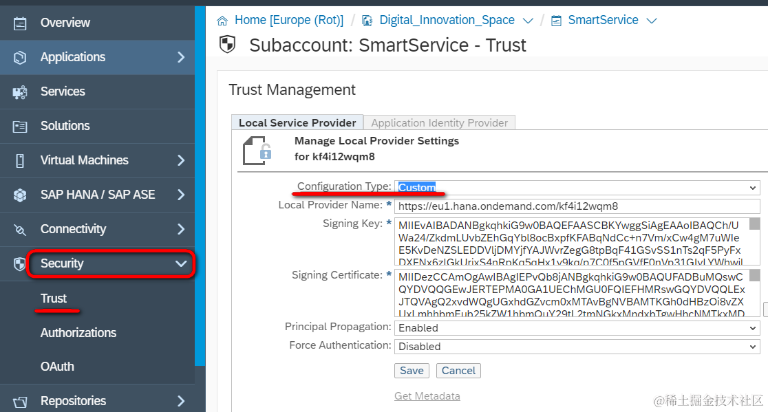 选择subaccount登录进去,选择Security菜单项下面的Trust,将Configuration Type设置为Custom,