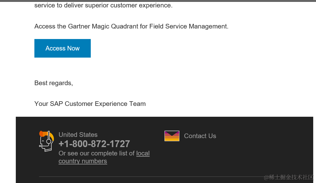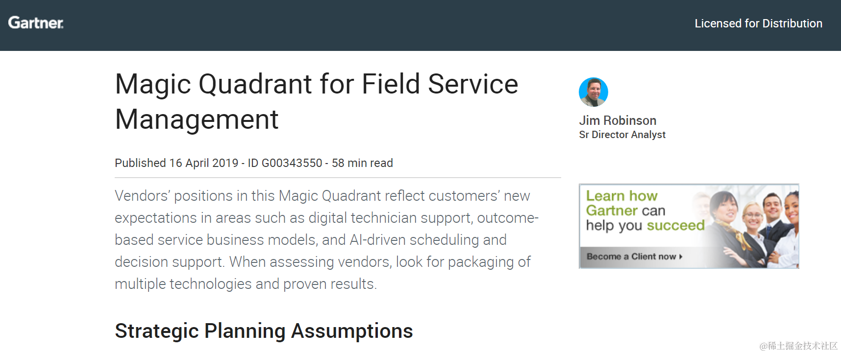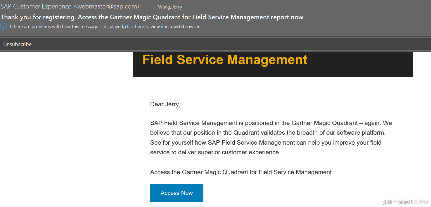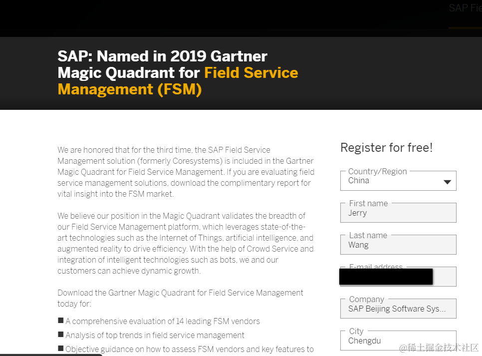 如何免费获得Gartner关于field Service management各产品魔力象限报告 已注销 2021-04-25 237 阅读1分钟 在登录SAP FSM的官网,如果不知道网址,直接baidu输入关键字SAP field Service management即可。 点击屏幕右下角的超链接:Read the report 按照要求把自己的联系方式,最重要的是填写邮箱地址: 提交之后,邮箱就会收到一封邮件。点击Access Now,就能访问Gartner关于市场上主流的FSM产品的分析报告了。 要获取更多Jerry的原创文章,请关注公众号"汪子熙":
