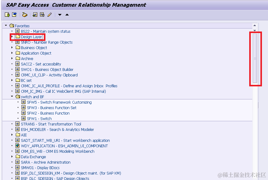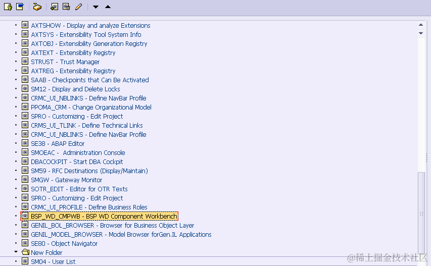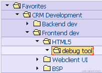 SAP Netweaver里有很多名字比较长的事务码,比如SAP CRM UI开发工具BSP_WD_CMPWB,直到今天我也记不住它。幸好SAP贴心地在SAP GUI里提供了收藏夹功能,我们可以在SAP GUI里创建树状结构的收藏夹事务码列表,可以把若干业务上相关的事务码放在同一个文件夹内,文件夹支持嵌套,如下图: