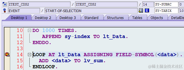 举个简单的例子,下图第15行ADD语句设置一个断点。因为它在一个具有1000行的内表循环体内,所以正常情况下会触发1000次。