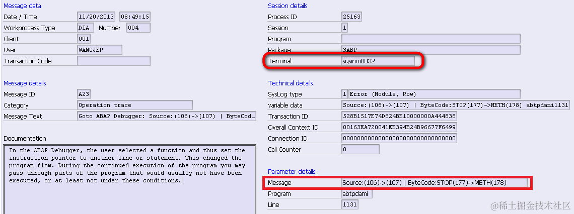 Terminal字段即在调试器里执行了语句跳转的用户使用的终端机器ID,每台连接到ABAP Netweaver服务器上的机器都具有一个唯一的终端ID.