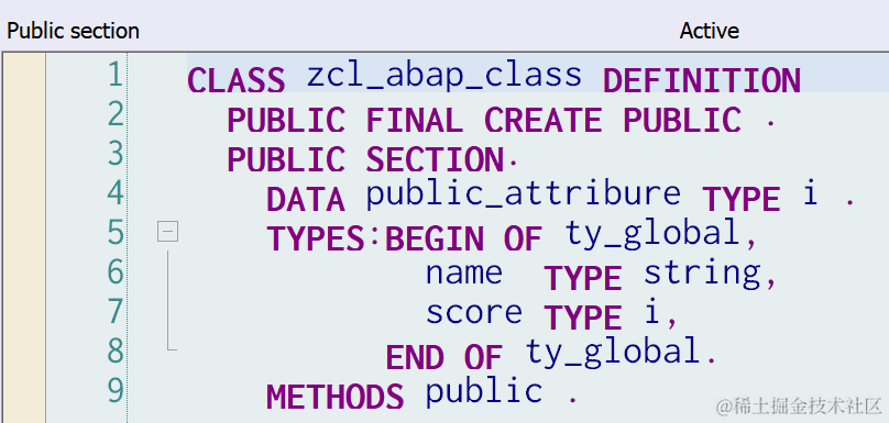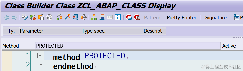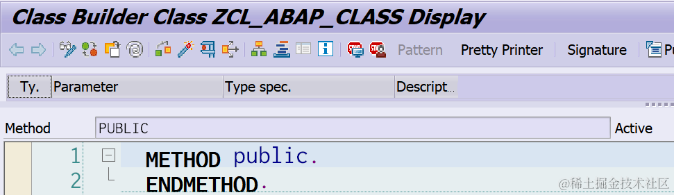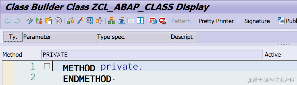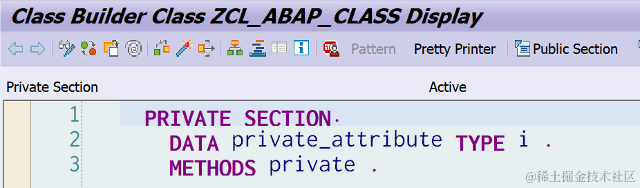 例如,SE38里打开ZCL_ABAP_CLASS================CM001,看到的是第一个私有方法的源代码: