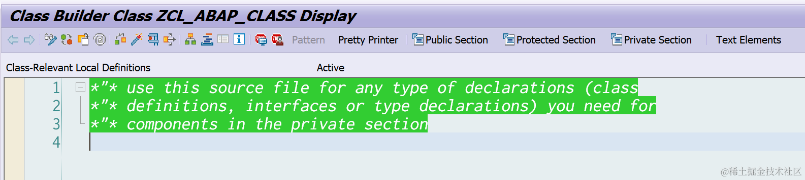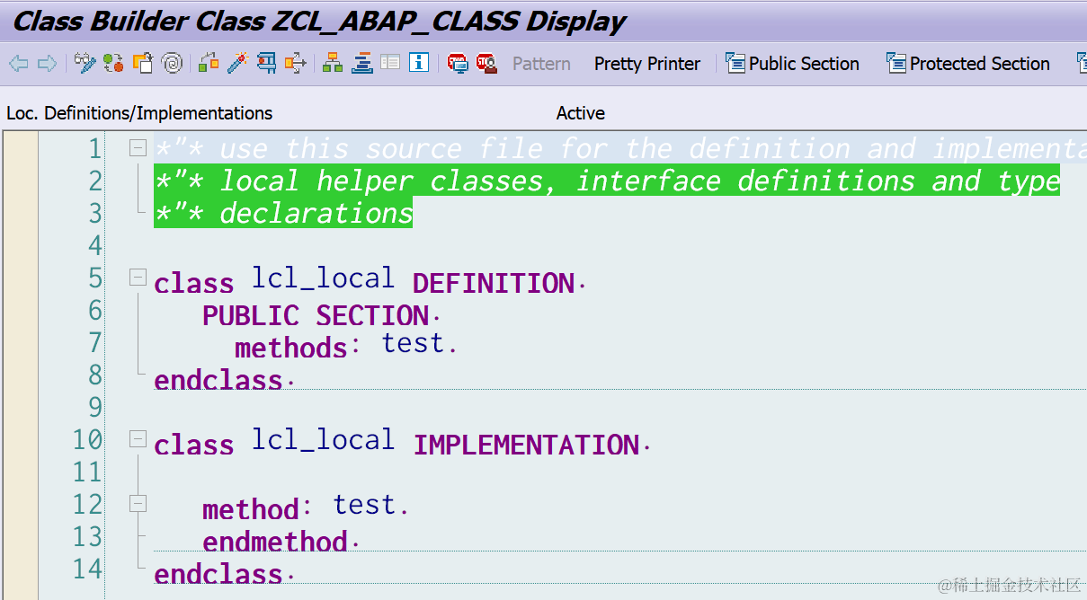 此处维护的是ABAP类的局部定义,包括类的局部类,局部接口,局部类型定义等等。