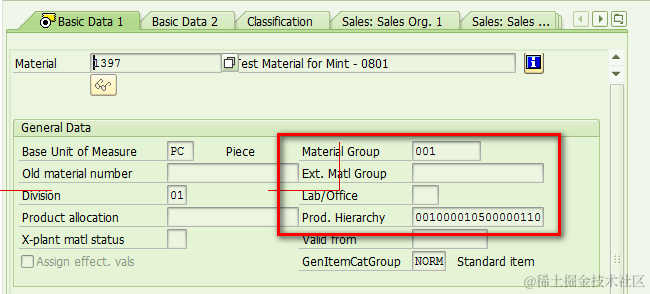 This material has 001 assigned as Material group, 001000010500000110 as product hierarchy.