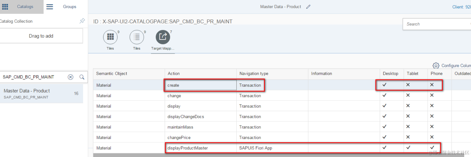 在Fiori Launchpad里根据该ID打开对应的catalog,发现有好几个和Material相关的跳转对象,其类型都为SAP GUI里的Transaction: