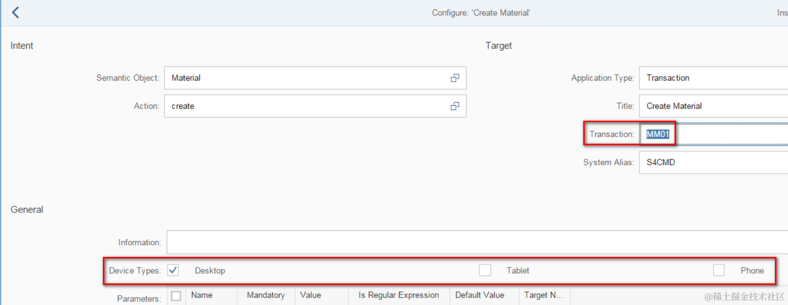 跳转的目的事务码ID MM01,配置在此处。同时Device Types里只支持桌面,这没什么问题,因为SAP GUI通过浏览器渲染出来的界面,不像SAP UI5那样具有响应式布局的功能,因此只能运行在桌面浏览器里。