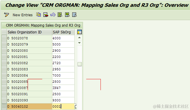 For example, ERP sales org 0001 is mapped to CRM O 50040102: