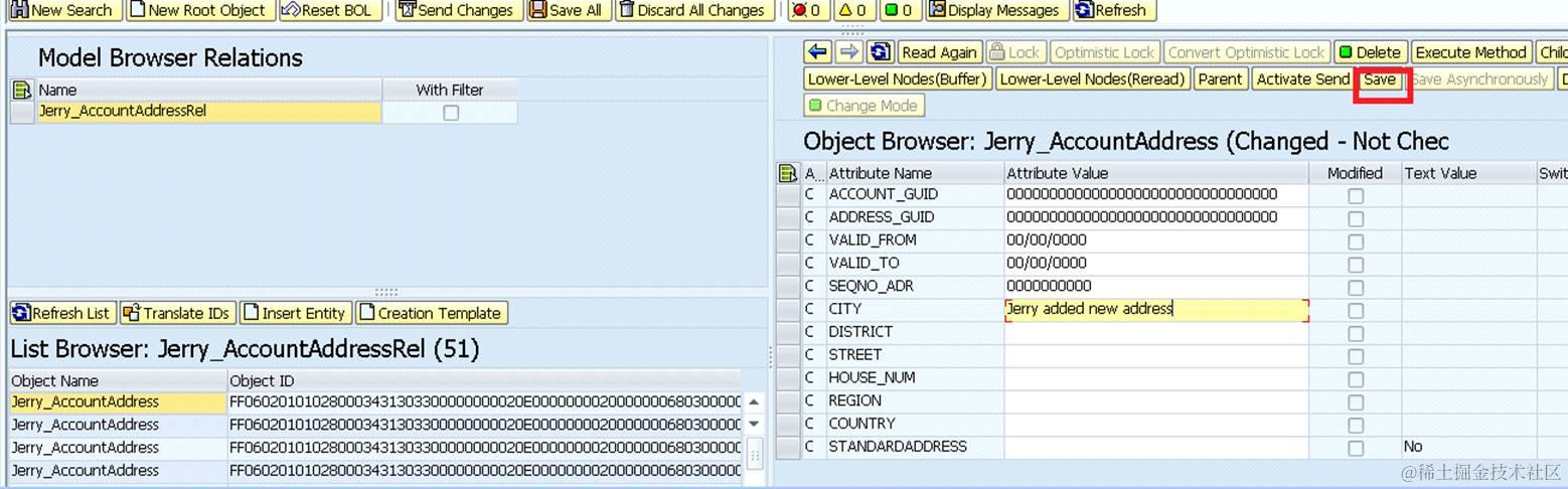 我在从Account navigate 到AccountAddress的地方加一段代码,分别存储两种方式得到的account address container object list,这个时候还没有真正取Account address,所以两个container object list里面都只有一个dummy的entry,is_handle = X
