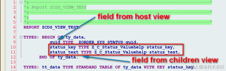 (1) Since there is no existing data type which holds both host view field and associated view fields, you have to create one on your own: