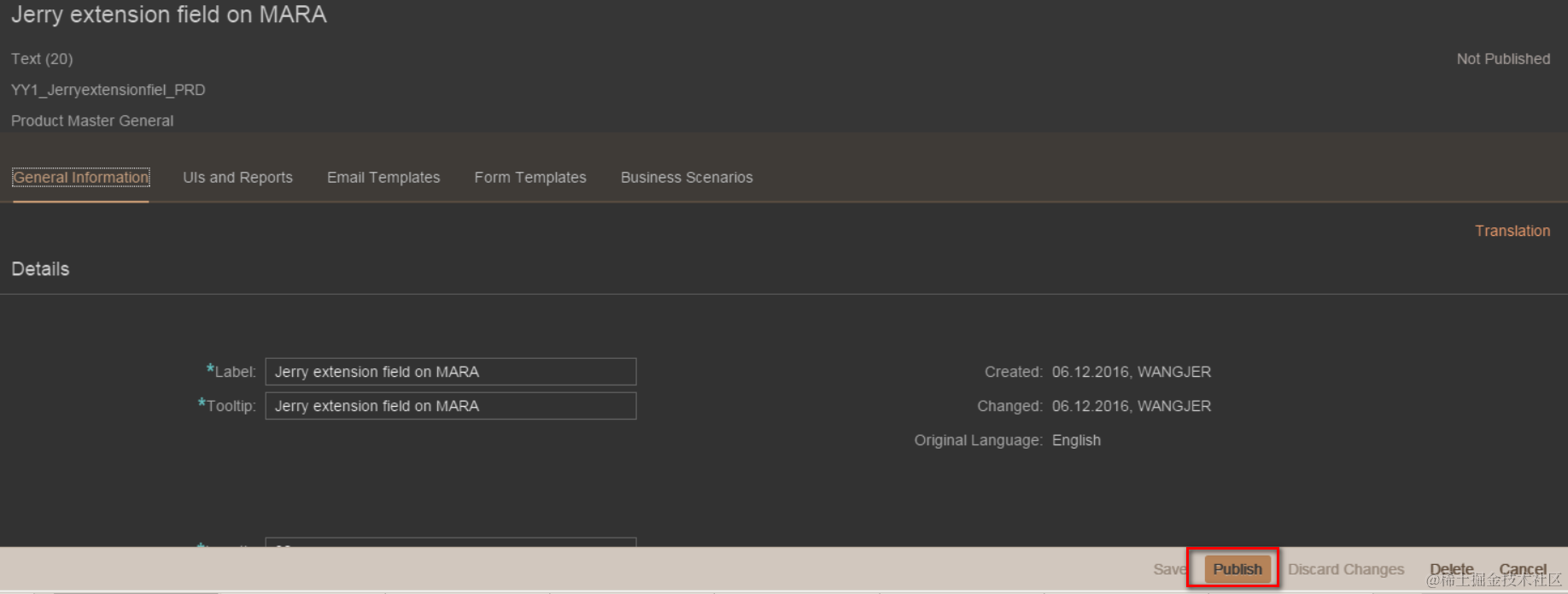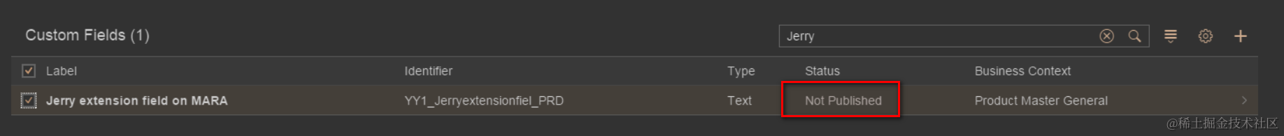 Just choose Text as extension field type and length: 20. Once created, it has status “Not Published”. In order to allow UI to add this field, you have to publish it.