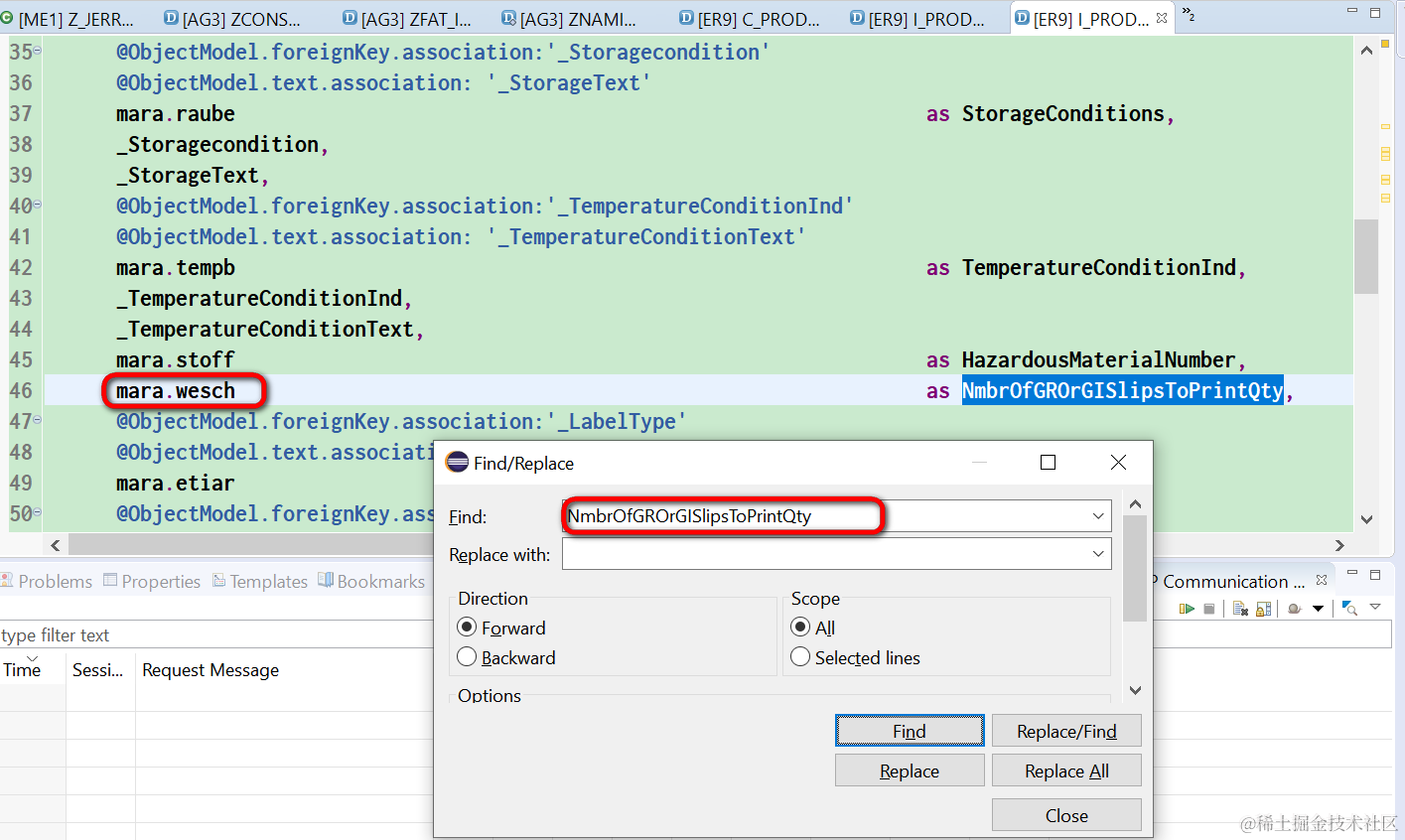 在这个视图的源代码里,根据第二步找到的字段名称NmbrOfGROrGISlipsToPrintQty进行搜索,立即就找到了对应的数据库表MARA里的字段为wesch: