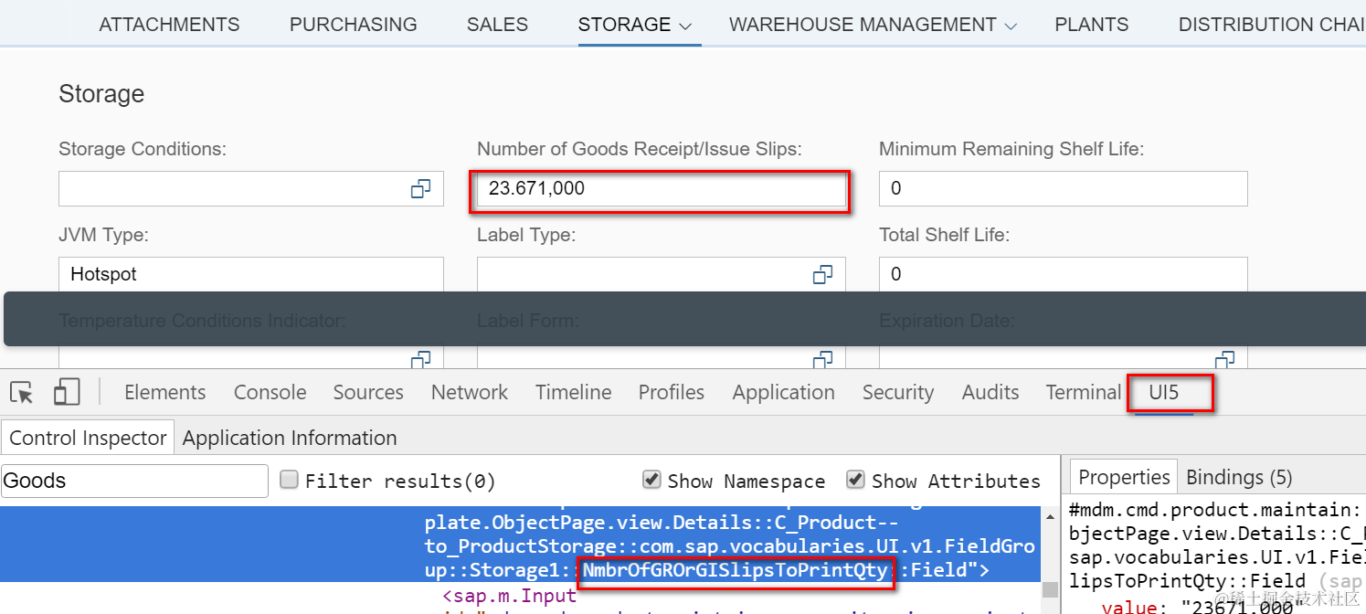 (1) 我们知道SAP UI5也是一个基于MVC的前端框架,框架支持双向绑定。在Chrome开发者工具里,找到这个UI字段绑定的模型字段名称: